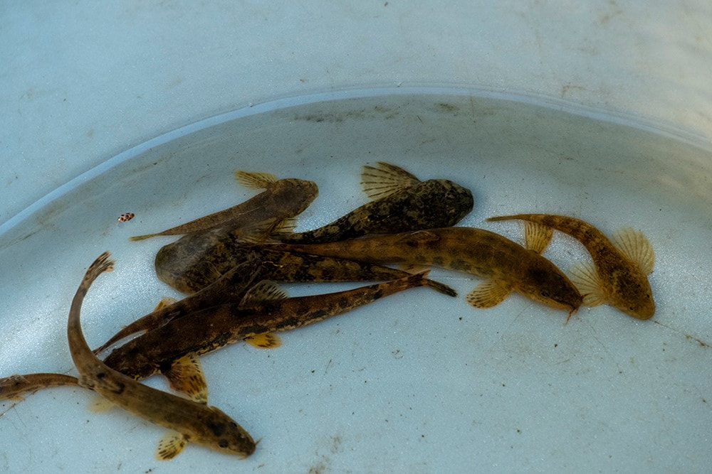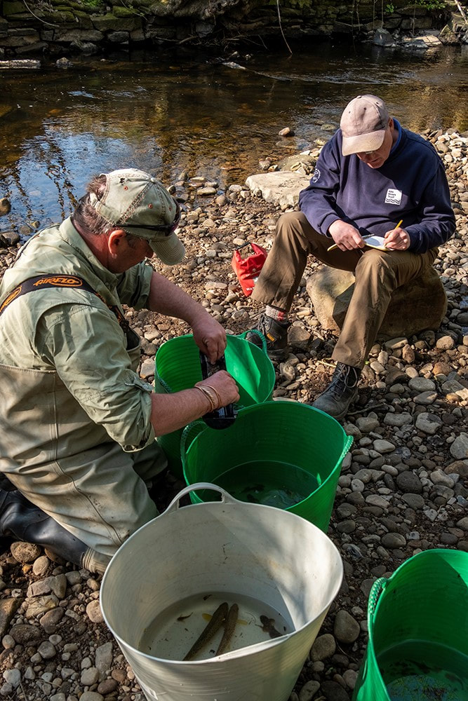 River Worth Friends and the Aire Rivers Trust have been monitoring the ecological status of the Worth for a number of years. We have used two methods for this; electrofishing to count the actual number and species of fish and riverfly monitoring to count the number of invertebrates (bugs) living in the river, on which the fish feed. As we have been doing this for about five years we can start to detect trends in the numbers. In this blog we will look at how we electrofish and then analyse the results. Electrofishing involves passing an electric current through the water to momentarily stun or disorientate the fish, making them easier to catch, we then take a count and measure the length of some species. You may have seen us demonstrating this at the Trout in the Town Conclave we hosted earlier this year. Fishing usually involves a team of 4 to 6 people, headed by Prof. Jon Grey of the Wild Trout Trust who wields the electric probe, there are two catchers with nets who scoop up the fish when they appear and pass them to the fourth person who keeps them in a bucket of water for later counting and measuring by one or two people on the bank. I said that the stunning makes the fish easier to catch but the job of the catcher is quite tricky as the fish are only briefly immobilised so you have to be quite quick witted and sure footed. Once counted and measured the fish will be fully recovered and are released back into the river. Five approximately 50 metre stretches are fished each spring. The lowest is by Kinara Close whilst the most upstream is at Damems. We asked Prof. Grey to explain some of the trends showing from the data over the past five years: